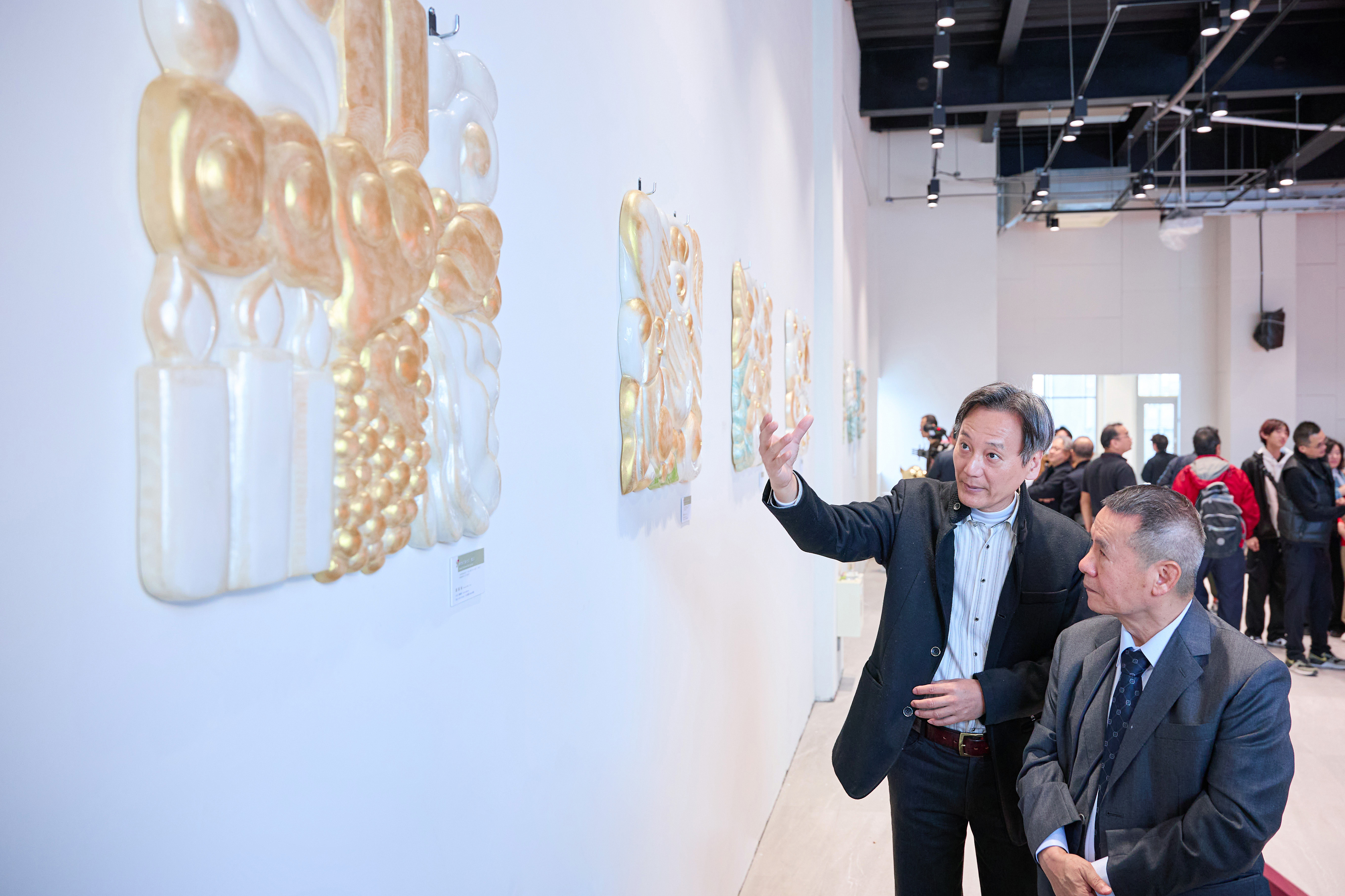 ▲Bronze sculpture artist Kuang- Wei Luo (left) introducing the Genesis Series to SDG Group Founder Jerry Lin (right).